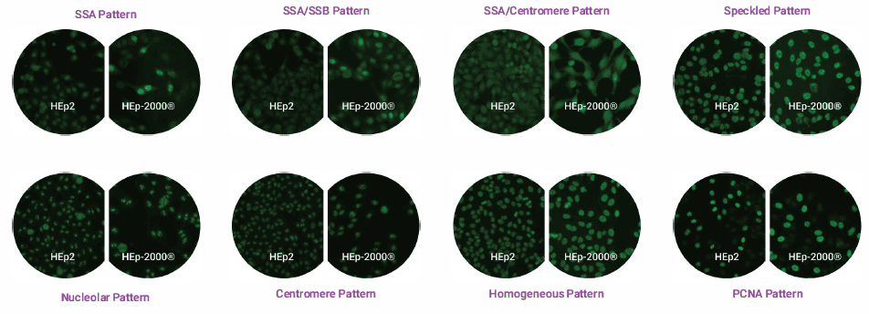 The HEp-2000® ANA Test System uses transfected mitotic human epithelioid cells (HEp-2). Historically, HEp-2 cells with mitotic figures have shown greater sensitivity and sharper pattern recognition than rodent kidney substrates. HEp-2000® contains HEp-2 cells transfected with multiple copies of the specific DNA sequence for the SSA/Ro autoantigen. Approximately 10-20% of the transfected cells over-express this antigen.
