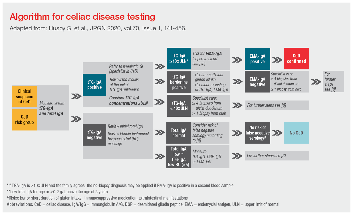The guidelines established by the European Society for Paediatric Gastroenterology, Hepatology, and Nutrition (ESPGHAN) provide a structured approach for diagnosing celiac disease. According to these guidelines, ESPGHAN advises that assessing total serum IgA along with IgA antibodies against tissue transglutaminase 2 (tTG-IgA) is more advantageous than using other testing combinations. IgG-based testing should be considered only if total IgA is low or undetectable.8 ESPGHAN advises against using deamidated gliadin peptide antibodies (DGP-IgG/IgA) for initial testing. Patients with positive results should then be referred to a paediatric gastroenterologist/specialist.8