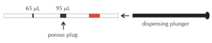During collection, blood stops when it reaches the porous plug. The plunger is used to reposition the porous plug to the 65 μL fill mark (for 65 μL cartridges) and to dispense the sample into the cartridge.