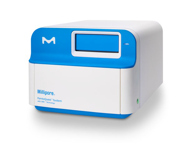 On the FemtoQuest instrument, signal is collected from free-floating fluorochromes using a rotating laser, camera, and counting individual molecules by an avalanche photodiode