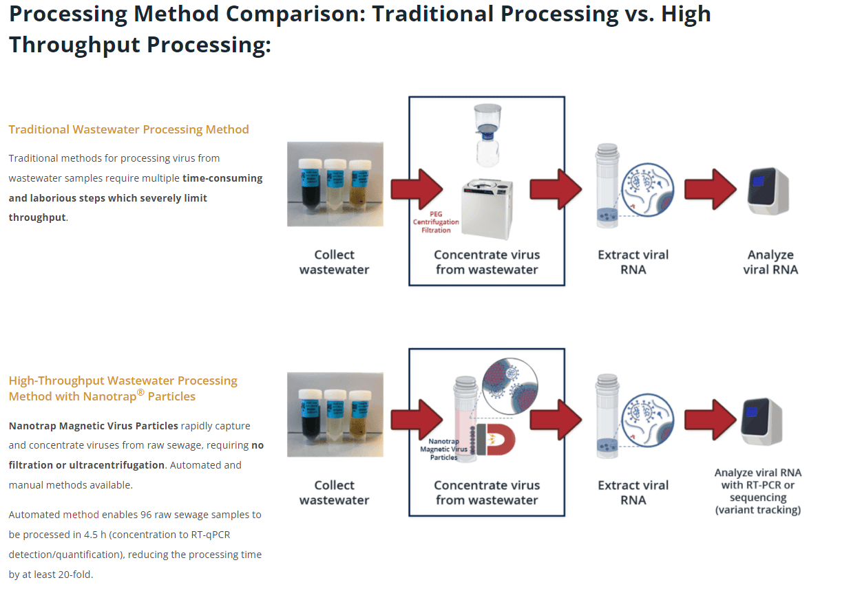 Nanotrap Magnetic Virus Particles concentrate SARS-CoV-21,2 from wastewater samples without ultracentrifugation or filtration.
