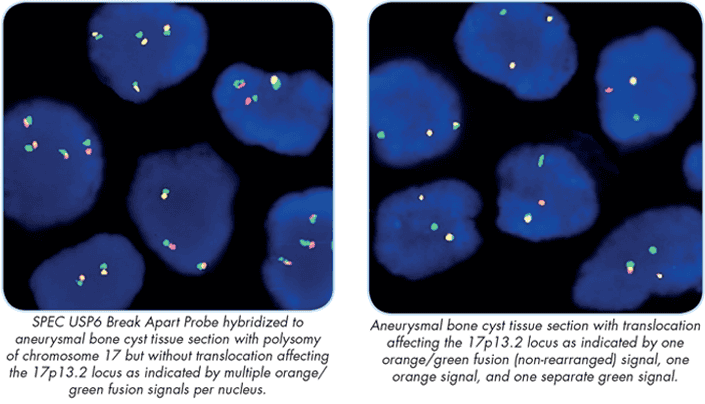 Products are for professional/laboratory use only.  The ZytoLight SPEC USP6 Dual Color Break Apart Probe is designed to detect translocations involving the chromosomal region 17p 13.2 harboring the USP6 gene. Translocations affecting USP6 have been initially found in primary aneurysmal bone cysts (ABC), a benign but locally aggressive bone lesion that occurs predominately during the first two decades of life. USP6 rearrangements are restricted to spindle cells in primary ABC, indistinguishable from surrounding normal spindle cells. The resulting fusion genes detected are formed by juxtaposition of the USP6 coding sequences to the highly active promoter sequences of several partner genes, as e.g. CDH11, COL1A1, OMD, TRAP150, and ZNF9, leading to the transcriptional upregulation of USP6. No true fusion genes are formed.